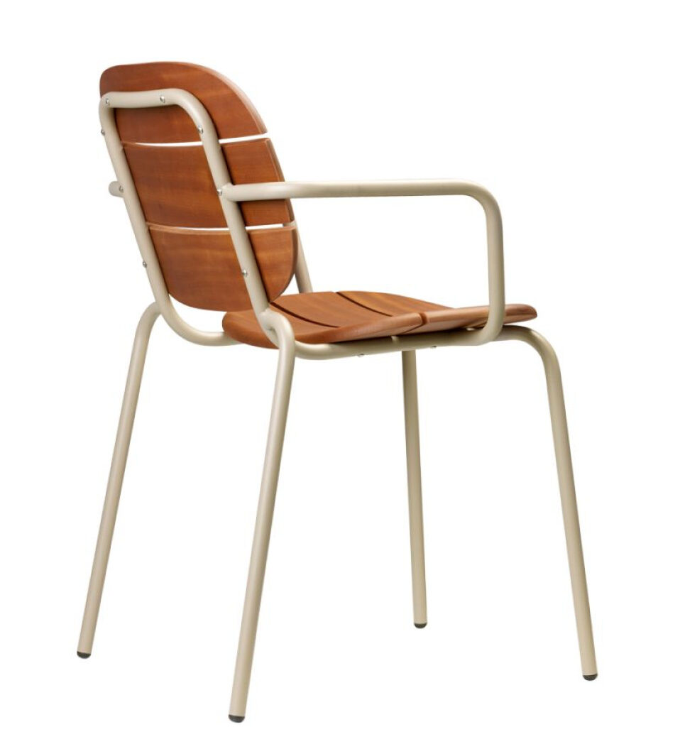Material: The frame of the Si-Si Wood chair is made of galvanized and powder-coated steel tubular profile Ø 20 mm. The seat and backrest are made of solid mahogany Sapelli wood, treated for outdoor use. The chair is 100% dismantlable, which enables proper recycling.